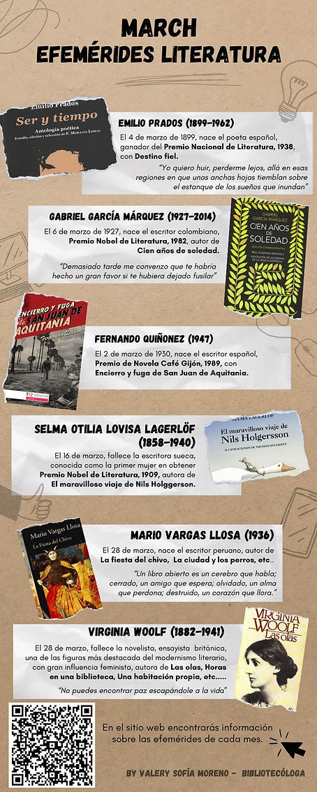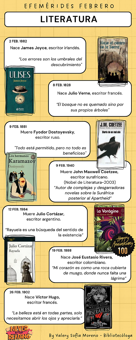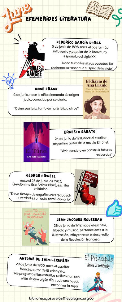 Pensando en ti, biblioteca ha creado este espacio para compartir fechas que valen la pena recordar, con el fin de promover la lectura y la cultura, es por esto que, mensualmente encontrarás piezas gráficas sobre fechas importantes relacionadas con escritores y otra referente a eventos históricos.